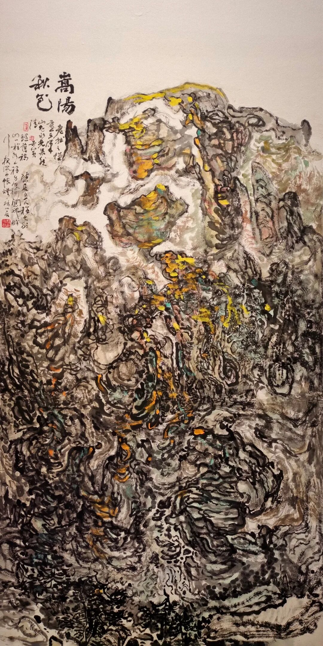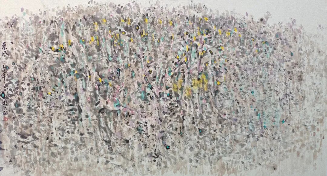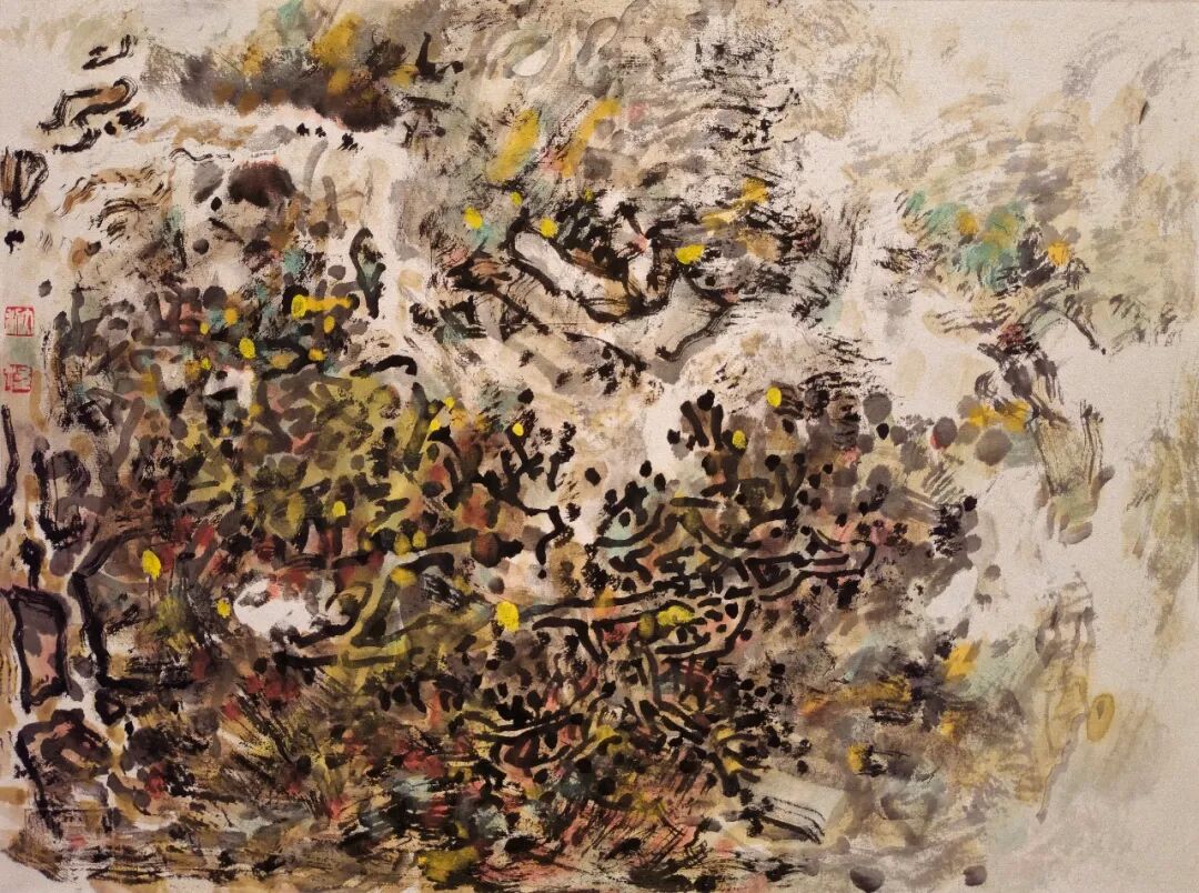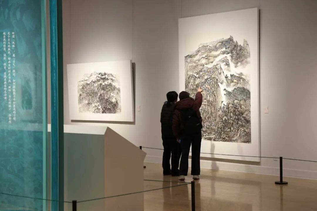 本次展览分为三个单元:第一单元集中梳理艺术家的创作脉络,包括新世纪初的两件早期作品,总结其从单色墨笔走向更为丰润的色彩表达;第二单元聚焦写生行旅,将写生与创作的“合一”理念贯穿作品,使自然的生机与艺术的想象在画幅中相互生发;第三单元展示其对笔墨语言的多样探索,从点线、皴染到章法经营均有新的试验,凸显艺术家将“我”、山川与时代融通为一的审美追求。展厅中穿插的诗文与札记,亦呈现其对艺术经验的提炼与思辨。