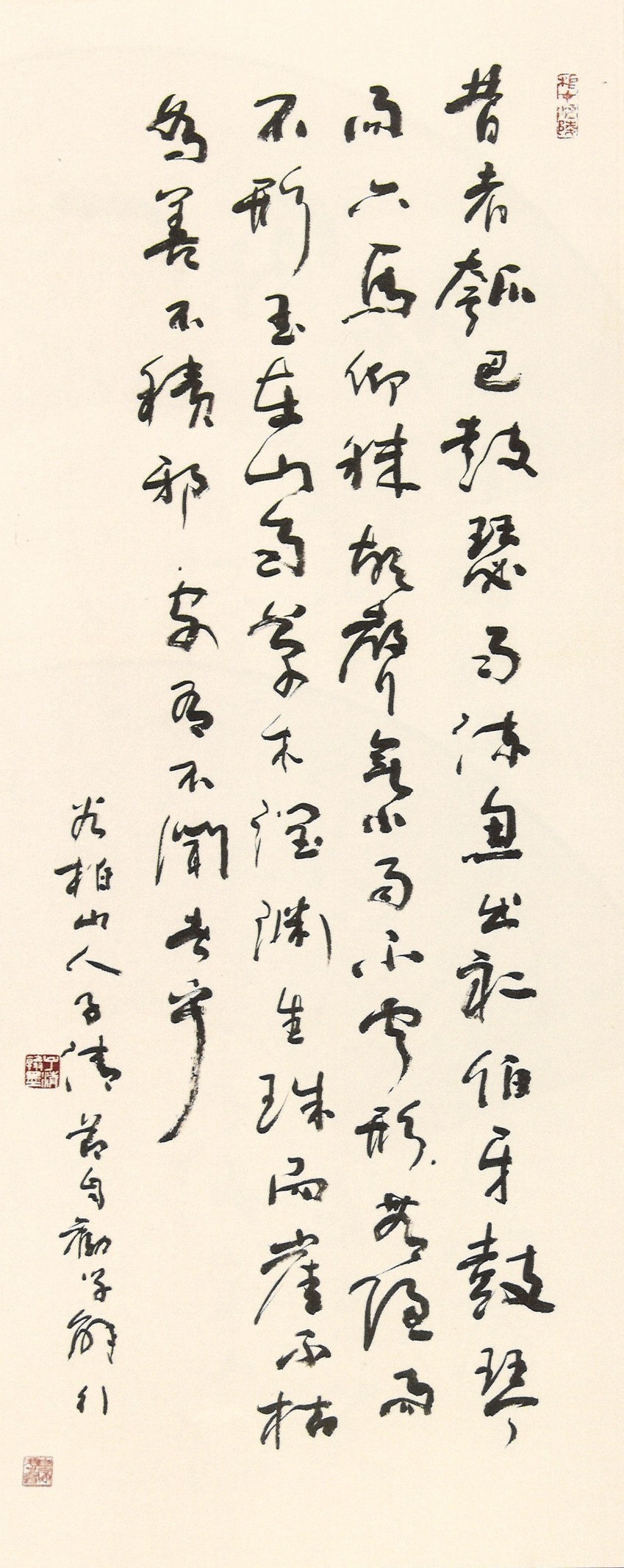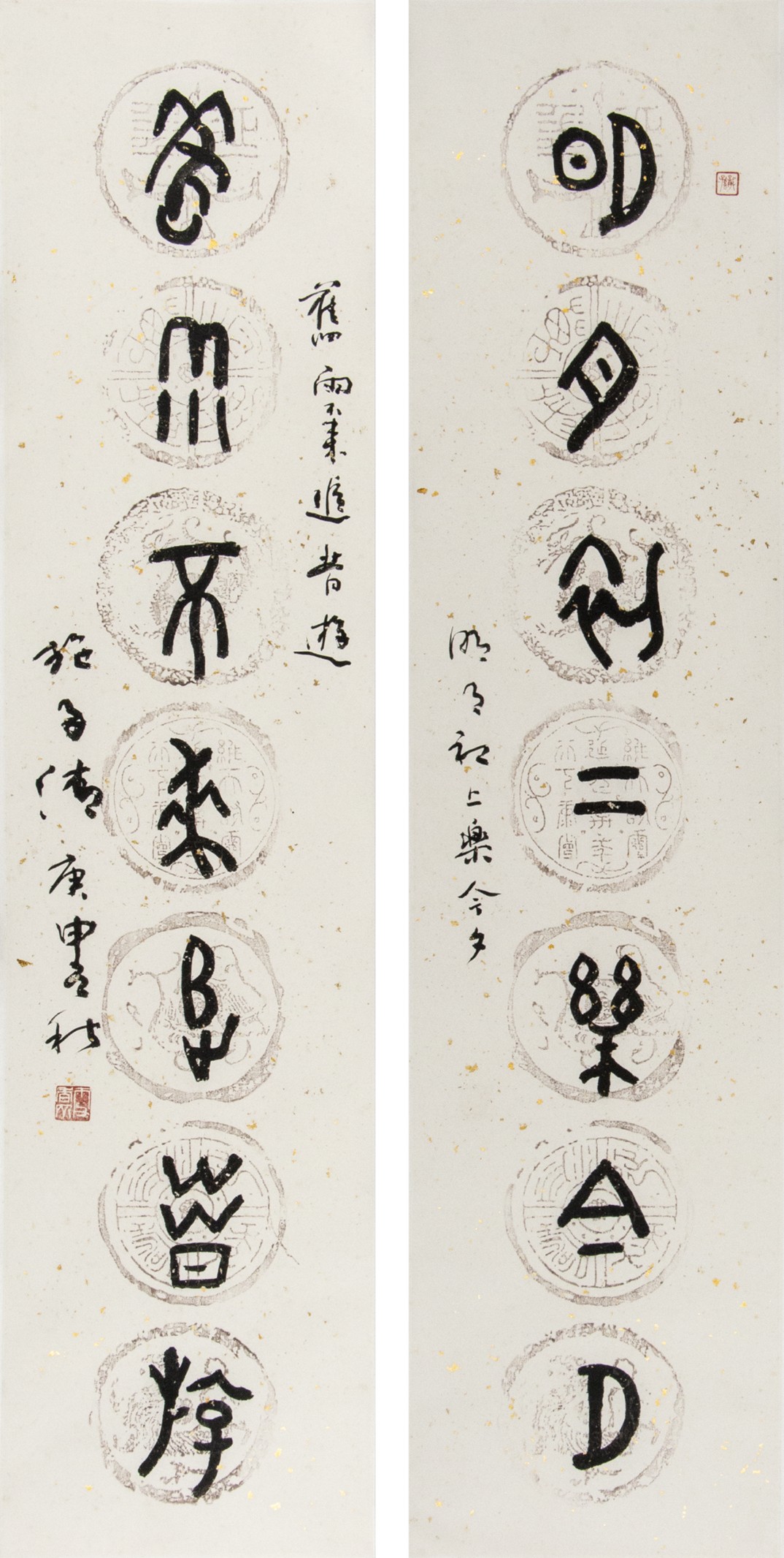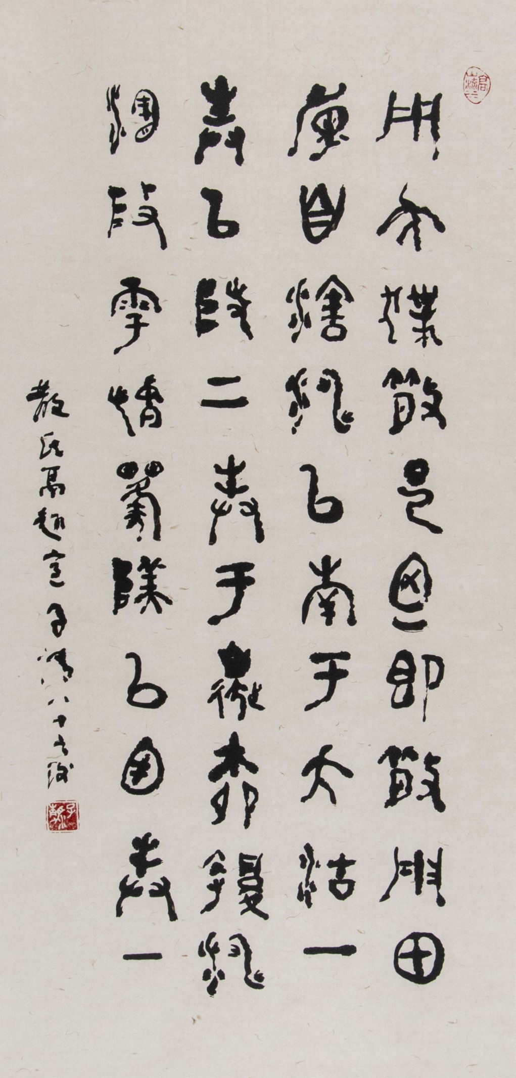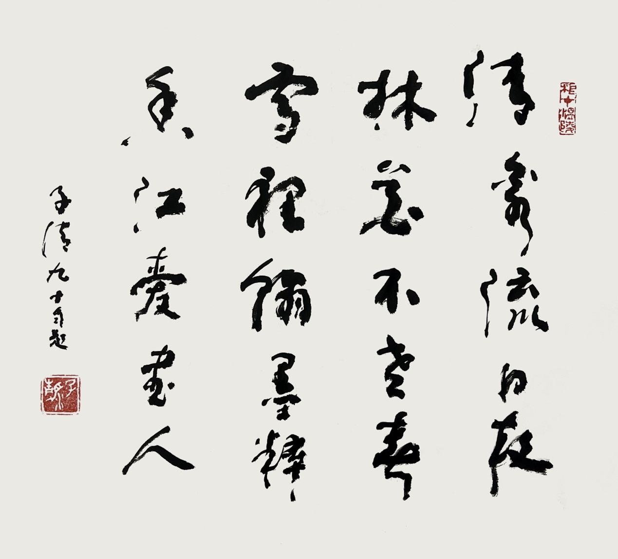 子清先生书艺之成就,首在其深湛的传统功力和鲜明的个人风格。其学书之路,根基深厚,上溯秦汉碑碣之雄浑古拙,下汲晋唐法帖之飘逸神韵,于“二王”之雅逸、鲁公之磅礴、米南宫之恣肆、王觉斯之跌宕,皆心摹手追,涵泳既久,深得三昧。其过人之处,更在于能融会贯通,不为古法所囿,敢于在深厚的传统沃土上生发新意。近30年则专注体悟清代大书家何绍基,欹侧变化,鸿笔纷披,线条奇崛,雄浑古雅,融铸碑帖自成一家。